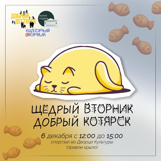 Дегтярск уже четыре года подряд участвует в акции Щедрый Вторник. Этот год не исключение. Инициатор и организатор Щедрого вторника в Дегтярске — АНО «Малая Родина — город для жизни» — приглашает всех жителей города к соучастию, чтобы сделать Дегтярск еще добрее и щедрее.